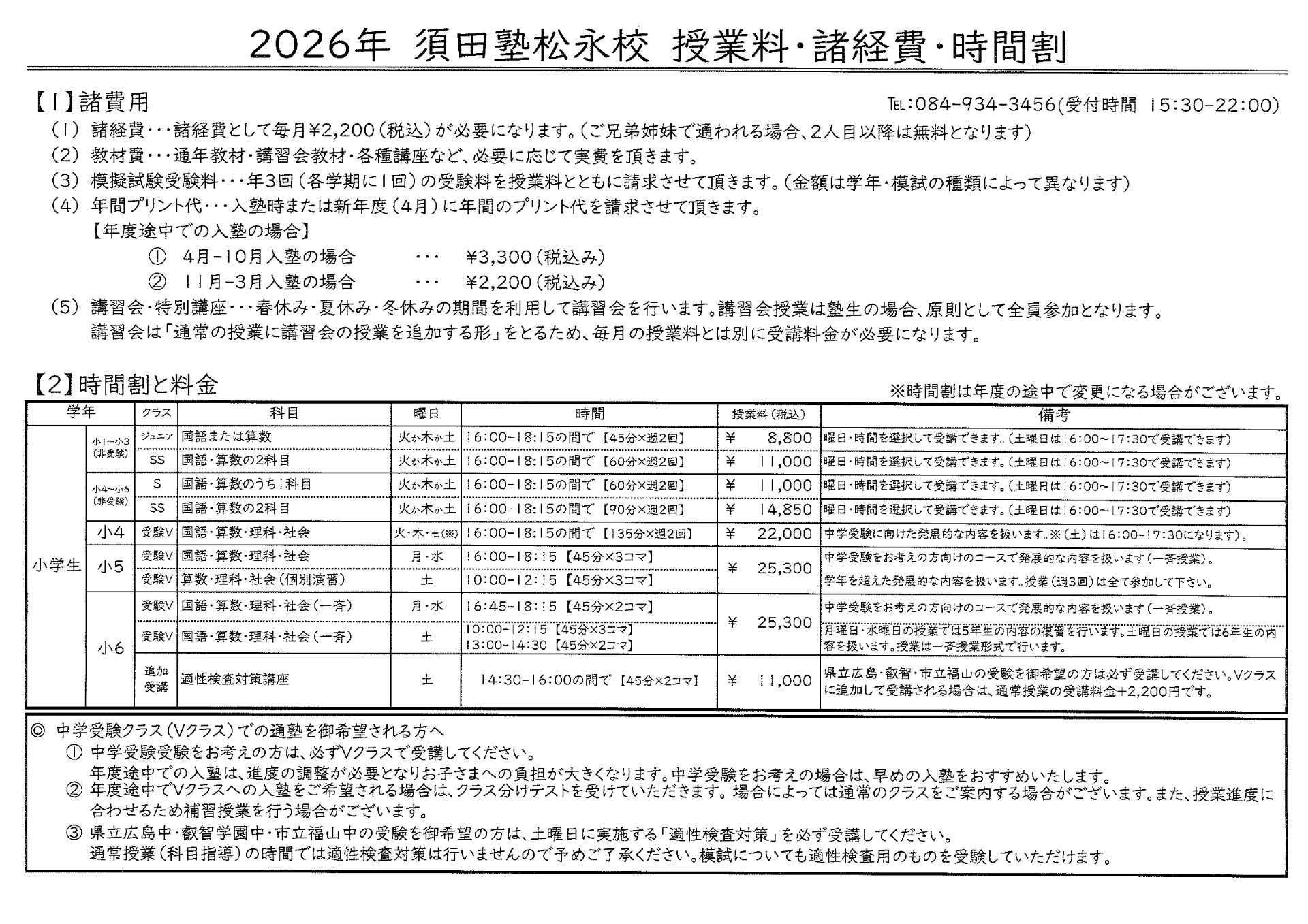 授業料、諸経費、および、時間割をクラス別にご案内しております。